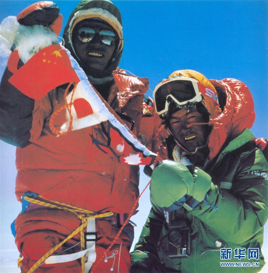 1960年5月25日,中国登山运动员王富洲、贡布、屈银华三人首次从北坡登上珠穆朗玛峰,创造了人类历史上第一次从北坡登上世界第一高峰的壮举。登山勇士们不畏险阻、一往无前的精神,鼓舞着一代代登山人向着珠穆朗玛峰前进。 这是1988年5月5日,中国登山运动员登顶后展示中国、日本和尼泊尔三国国旗。1988年5月,中国、日本和尼泊尔三国登山家携手挑战珠峰,从南北两侧会师顶峰、双向跨越珠峰成功。 新华社发