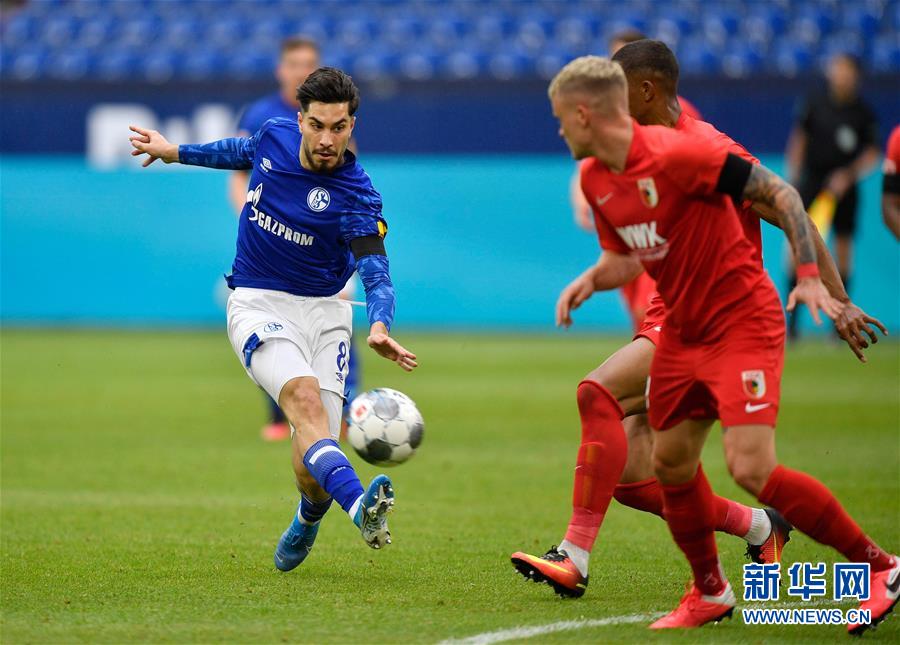 5月24日,沙尔克04队球员塞尔达(左)在比赛中控球。 当日,在2019-2020赛季德国足球甲级联赛第27轮比赛中,奥格斯堡队客场以3比0战胜沙尔克04队。 新华社/法新