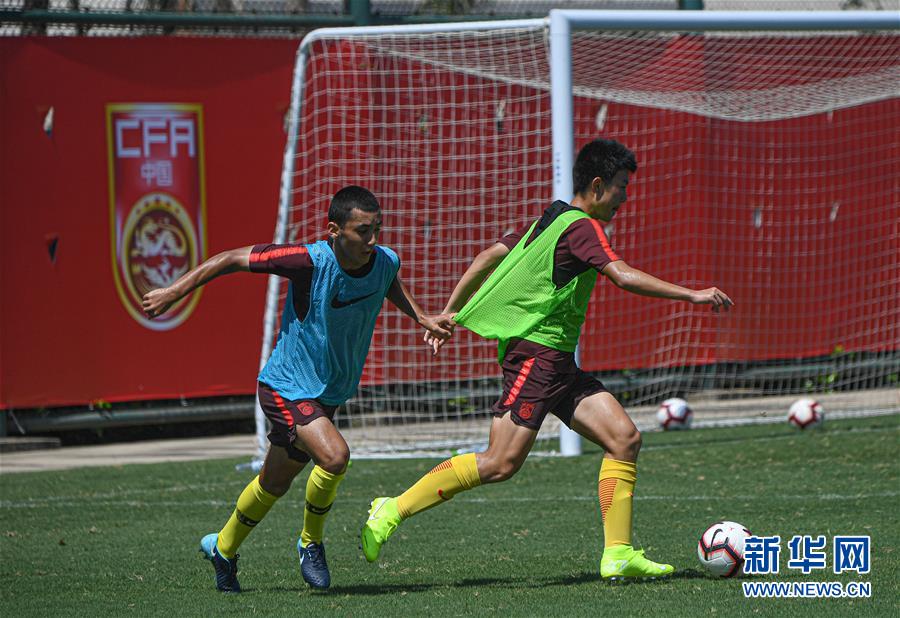 5月25日,中国男足U16国少队队员杨德江(右)与队友穆合力斯·沙迪克在训练中。 当日,中国男足U16国少队在海口观澜湖足球基地训练,备战巴林亚少赛。 新华社记者蒲晓旭摄