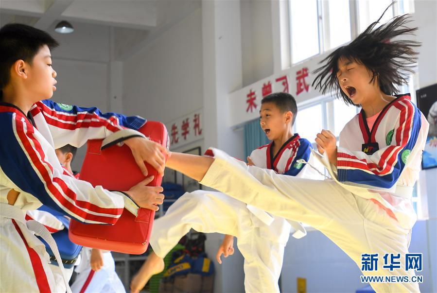 5月26日,学生在跆拳道课上练习。 湖南长沙开福区清水塘第三小学在做好疫情防护的前提下,有序安排跆拳道特色体育课程,帮助学生放松身心,提高身体素质。 新华社记者陈泽国摄