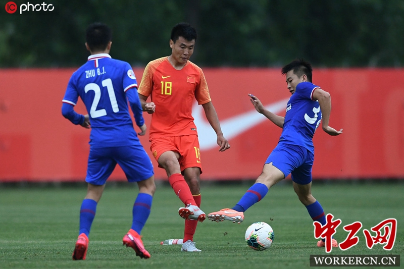 2020年5月26日,上海,2020足球热身赛,中国国家男子足球队VS上海绿地申花。 董学升、温家宝拼抢 张同舟摄