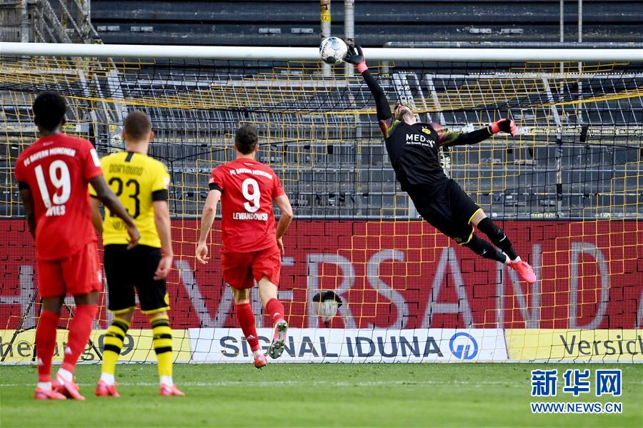 5月26日,多特蒙德队守门布尔基(右)在比赛中扑救不及。 当日,在2019-2020赛季德国足球甲级联赛第28轮比赛中,拜仁慕尼黑队客场以1比0战胜多特蒙德队。 新华社/路透