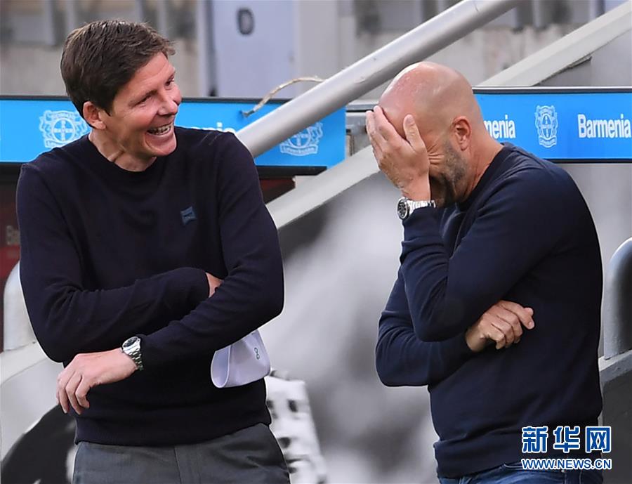 5月26日,沃尔夫斯堡队主教练格拉斯纳(左)与勒沃库森队主教练博斯在比赛前。 当日,在2019-2020赛季德甲联赛第28轮比赛中,沃尔夫斯堡队客场以4比1战胜勒沃库森队。 新华社/路透