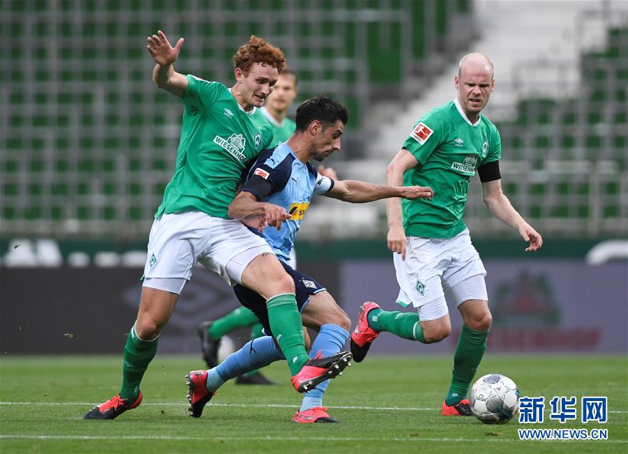 5月26日,门兴格拉德巴赫队球员施廷德尔(中)在比赛中突破不来梅队球员萨金特(左)防守。 当日,在2019-2020赛季德国足球甲级联赛第28轮比赛中,云达不莱梅队主场以0比0战平门兴格拉德巴赫队。 新华社/路透