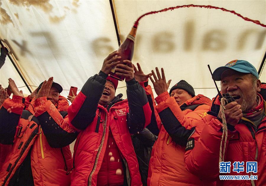 5月27日,登顶成功后,在海拔5200米的珠峰大本营,工作人员开香槟庆祝。新华社记者 孙非 摄