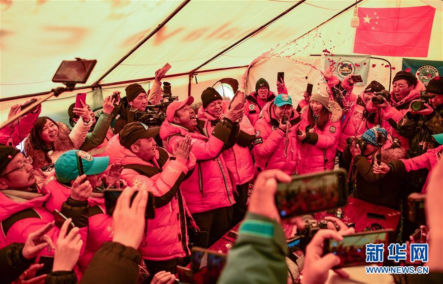 5月27日,登顶成功后,在海拔5200米的珠峰大本营,工作人员开香槟庆祝。新华社记者 晋美多吉 摄