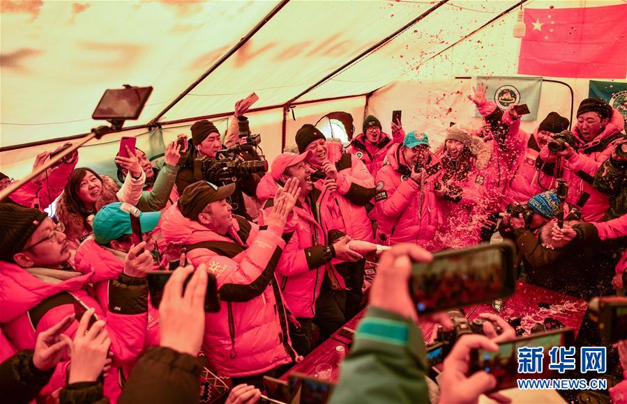 5月27日,登顶成功后,在海拔5200米的珠峰大本营,工作人员开香槟庆祝。新华社记者 普布扎西 摄