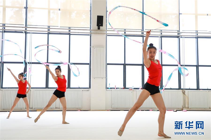 5月27日,贵州省体操队艺术体操队员们在训练带操。 近日,在位于贵阳市的贵州省体操运动管理中心,贵州省体操队在做好疫情防控的前提下抓紧时间坚持训练,全力备战2021年全运会等比赛。 新华社记者刘续摄