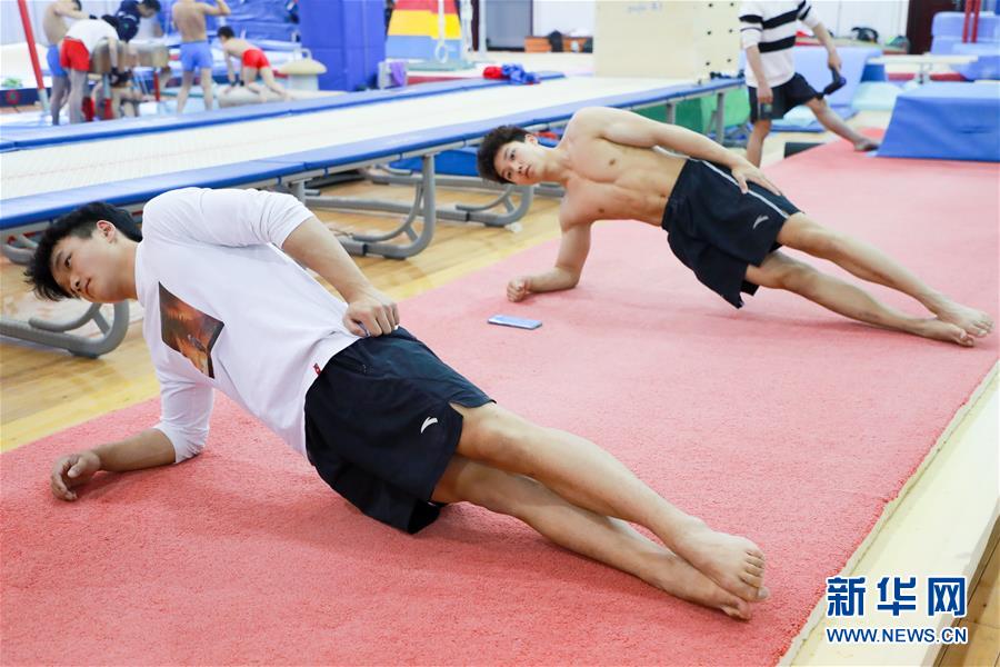 5月27日,贵州省体操队队员杜镇宇(左)和龙梓蒸在训练中。 近日,在位于贵阳市的贵州省体操运动管理中心,贵州省体操队在做好疫情防控的前提下抓紧时间坚持训练,全力备战2021年全运会等比赛。 新华社记者刘续摄