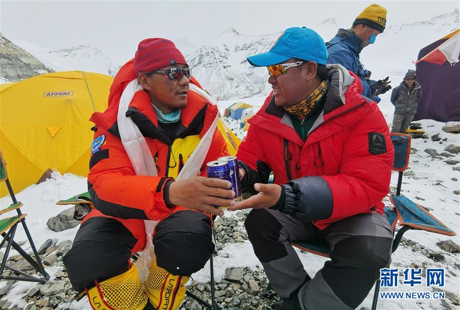 5月28日,测量登山队员返回前进营地后庆祝登顶。 当日,中国2020珠峰高程测量登山队安全返回海拔6500米的前进营地。5月27日,测量登山队成功登顶珠穆朗玛峰并完成峰顶测量等工作。 新华社特约记者 扎西次仁 摄