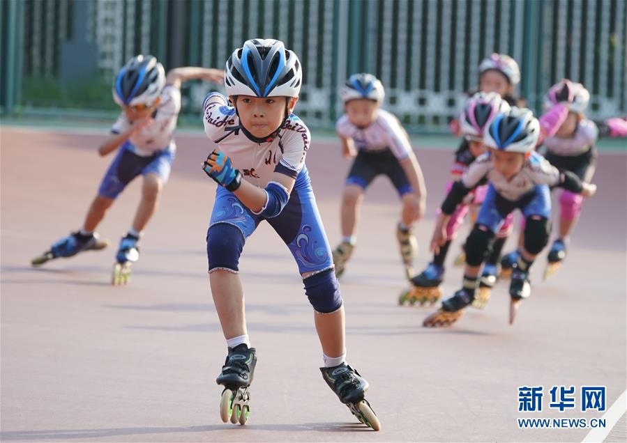 5月29日,秦皇岛市北戴河轮滑队的小队员李儒帅(前)在训练中。 近日,河北省秦皇岛市北戴河轮滑队在做好疫情防控的前提下,逐步恢复了日常训练。 新华社记者杨世尧摄