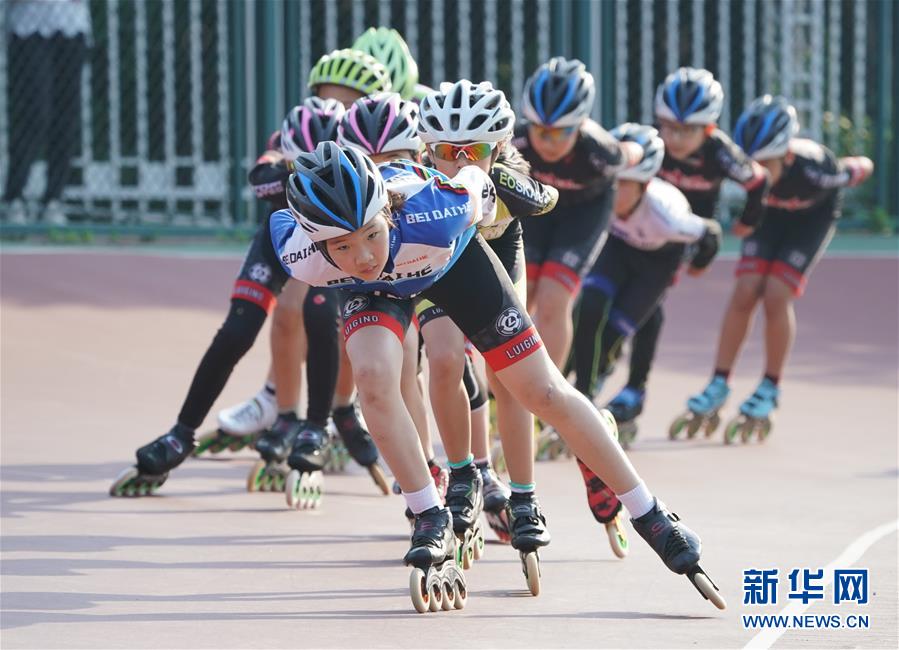 5月29日,秦皇岛市北戴河轮滑队的小队员刘一冉(前)在训练中。 近日,河北省秦皇岛市北戴河轮滑队在做好疫情防控的前提下,逐步恢复了日常训练。 新华社记者杨世尧摄