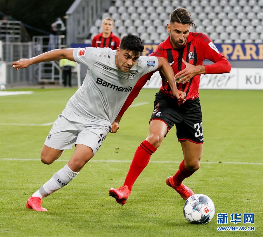 5月29日,勒沃库森队球员阿米里(左)与弗赖堡队球员格里福在比赛中拼抢。 当日,在2019-2020赛季德甲联赛第29轮比赛中,勒沃库森队客场以1比0战胜弗赖堡队。 新华社/法新