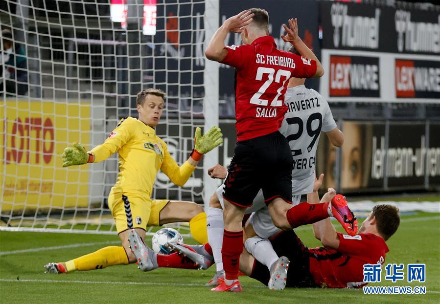 5月29日,勒沃库森队球员哈弗茨(右二)在比赛中破门得分。 当日,在2019-2020赛季德甲联赛第29轮比赛中,勒沃库森队客场以1比0战胜弗赖堡队。 新华社/法新