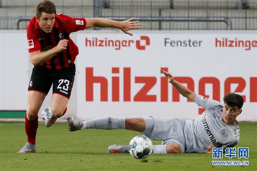 5月29日,勒沃库森队球员哈弗茨(右)与弗赖堡队球员海因茨在比赛中拼抢。 当日,在2019-2020赛季德甲联赛第29轮比赛中,勒沃库森队客场以1比0战胜弗赖堡队。 新华社/法新