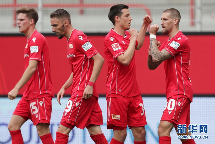 6月7日,柏林联合队球员安德里希(右一)进球后与队友庆祝。 当日,在2019-2020赛季德国足球甲级联赛第30轮比赛中,沙尔克04队客场以1比1战平柏林联合队。 新华社/路透