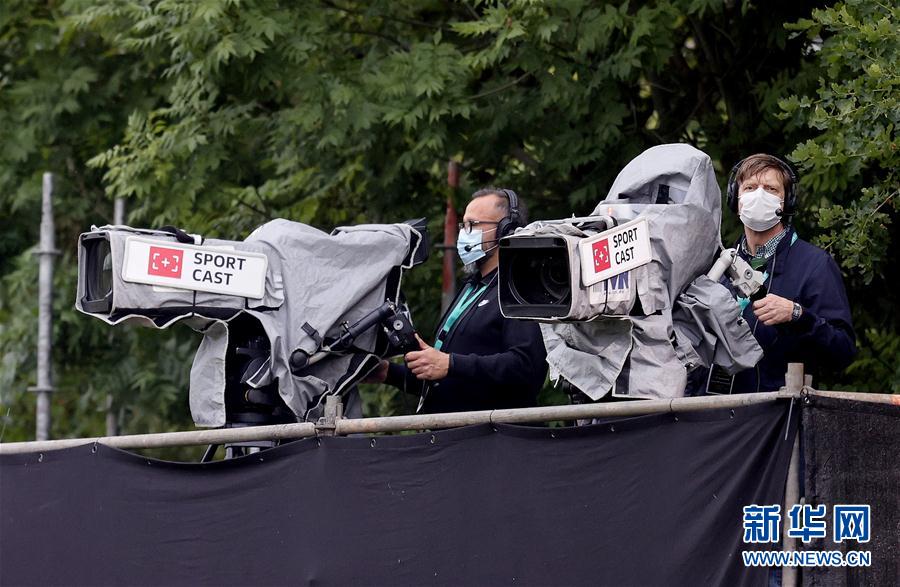 6月9日,摄像师佩戴口罩在场边工作。 当日,在德国沃尔克林根举行的2019-2020赛季德国杯足球赛半决赛中,勒沃库森队客场以3比0战胜萨尔布吕肯队,晋级决赛。 新华社/路透