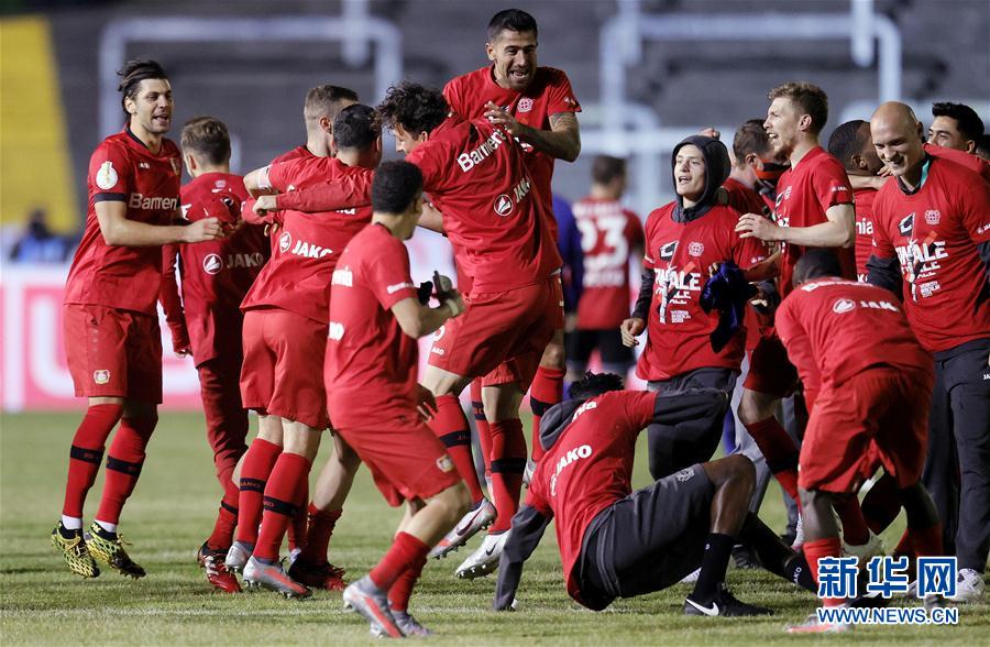 6月9日,勒沃库森队球员庆祝胜利。 当日,在德国沃尔克林根举行的2019-2020赛季德国杯足球赛半决赛中,勒沃库森队客场以3比0战胜萨尔布吕肯队,晋级决赛。 新华社/路透