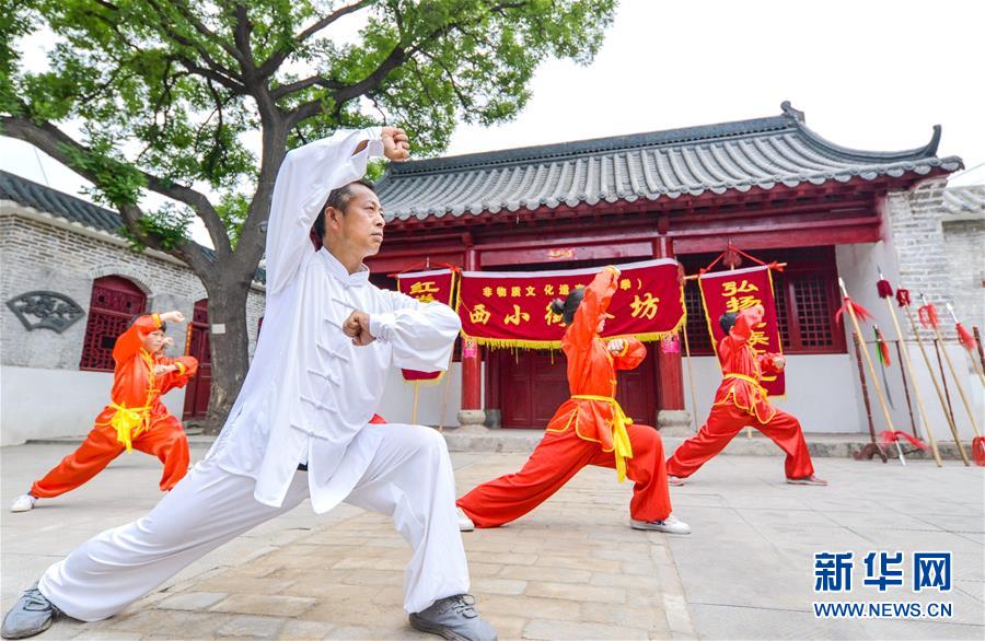6月11日,在河北省邯郸市峰峰矿区义井镇西王看村,柴林(左二)在武跤馆指导孩子练习红拳。 红拳是河北省邯郸市峰峰矿区当地特色武术项目,已列入河北省省级非物质文化遗产名录。为了传统武术得到更好的传承和推广,第六代红拳传承人柴林利用业余时间,为村里的孩子免费教授传统武术,让孩子们在学习之余锻炼身体,强健体魄。 新华社记者 王晓 摄