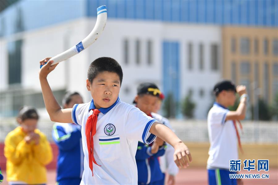 6月11日,一名学生在打布鲁。 自2010年起,位于内蒙古自治区鄂尔多斯市杭锦旗的杭锦旗蒙古族实验小学在基础体育课程上开设了射箭、搏克、布鲁等蒙古族传统体育项目课程。杭锦旗蒙古族实验小学的12位体育教师中,有3位专职讲授蒙古族传统体育课程。 新华社发(贝赫摄)