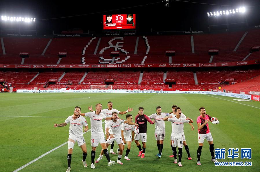 6月11日,塞维利亚队球员赛后庆祝胜利。 当日,停摆三个月的2019-2020赛季西甲联赛重启,成为欧洲足球五大联赛中继德甲之后第二个重启的联赛。在复赛后的首场比赛中,塞维利亚队主场以2比0战胜皇家贝蒂斯队。 新华社/路透