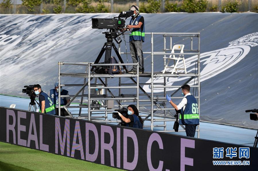 6月14日,媒体工作人员在场边忙碌。 当日,在2019-2020赛季西班牙足球甲级联赛第28轮比赛中,皇家马德里队主场以3比1战胜埃瓦尔队。 新华社/法新