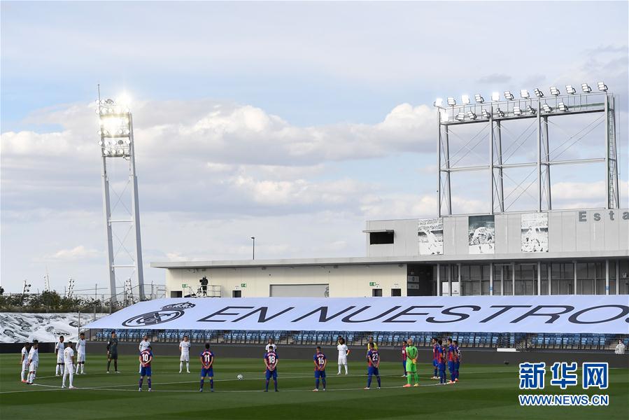 6月14日,双方球员在比赛开始前默哀,悼念新冠肺炎的病逝者。当日,在2019-2020赛季西班牙足球甲级联赛第28轮比赛中,皇家马德里队主场以3比1战胜埃瓦尔队。 新华社/法新