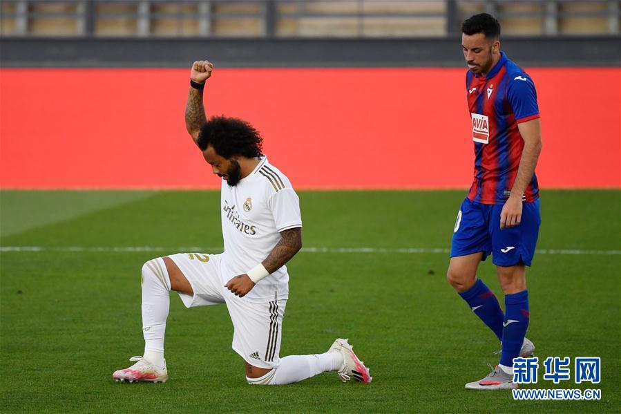 6月14日,皇家马德里队球员马塞洛(左)庆祝进球。当日,在2019-2020赛季西班牙足球甲级联赛第28轮比赛中,皇家马德里队主场以3比1战胜埃瓦尔队。 新华社/法新
