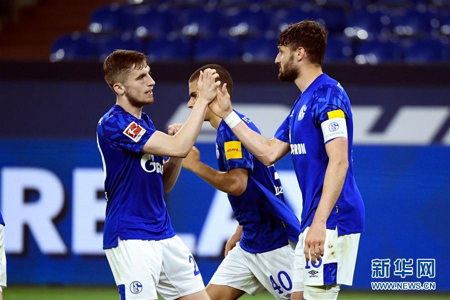 6月14日,沙尔克04队球员卡利朱里(右)进球后与队友肯尼庆祝。 当日,在2019-2020赛季德国足球甲级联赛第31轮比赛中,沙尔克04队主场以1比1战平勒沃库森队。 新华社/法新