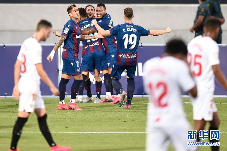 6月15日,莱万特队球员在比赛中庆祝进球。当日,在2019-2020赛季西班牙足球甲级联赛第29轮比赛中,莱万特队主场以1比1战平塞维利亚队。 新华社/法新