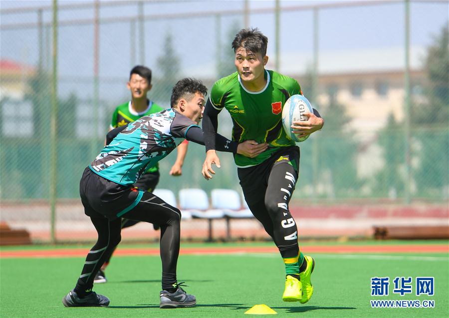 6月16日,内蒙古男子橄榄球队队员王海亮(右)在全线开接球抢接训练中。 近日,在做好疫情防控的前提下,内蒙古自治区橄榄球队在呼和浩特市武川县开展训练,全力备战2021年全运会等比赛。 新华社记者彭源摄