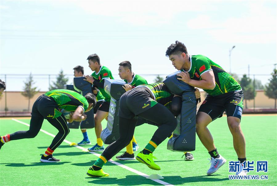 6月16日,内蒙古男子橄榄球队队员在进行撞击训练。 近日,在做好疫情防控的前提下,内蒙古自治区橄榄球队在呼和浩特市武川县开展训练,全力备战2021年全运会等比赛。 新华社记者彭源摄
