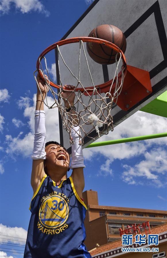 近年来,四川省阿坝藏族羌族自治州不断强化学校体育工作,实施学校体育固本行动,培养和引导学生热爱体育运动,养成良好的体育运动习惯,让学生在体育锻炼中享受乐趣、增强体质、健全人格、锤炼意志。该州各学校积极开展形式多样的校园阳光体育活动,保证每天让学生参加一小时的户外体育活动,确保学生掌握两项体育技能。2020年,该州初中毕业升学体育考试成绩的总分从30分提高到了70分。 图为四川省阿坝藏族羌族自治州阿坝县民族寄宿制小学的学生在体育课上练习扣篮(6月14日摄)。 新华社记者 刘坤 摄