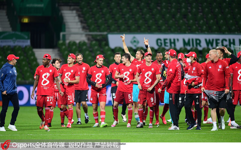 人民网北京6月17日电 北京时间6月17日凌晨,2019-2020赛季德甲第32轮继续进行,云达不莱梅主场迎战领头羊拜仁慕尼黑。莱万多夫斯基打破僵局,戴维斯被红牌罚下,最终拜仁1-0击败对手,夺得联赛11连胜后积分达到76分,领先少赛一场的多特蒙德达10分,提前两轮夺冠,豪取联赛8连冠!