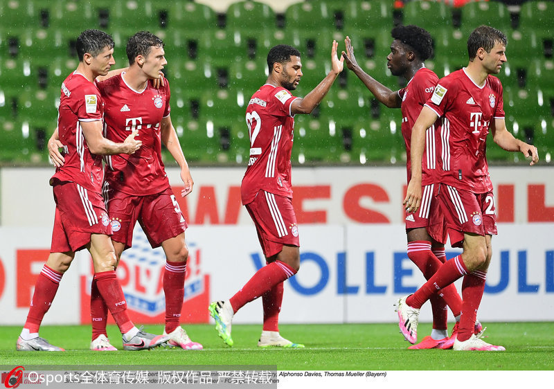 人民网北京6月17日电 北京时间6月17日凌晨,2019-2020赛季德甲第32轮继续进行,云达不莱梅主场迎战领头羊拜仁慕尼黑。莱万多夫斯基打破僵局,戴维斯被红牌罚下,最终拜仁1-0击败对手,夺得联赛11连胜后积分达到76分,领先少赛一场的多特蒙德达10分,提前两轮夺冠,豪取联赛8连冠!