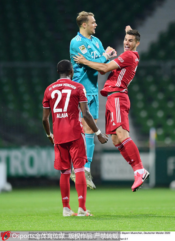 诺伊尔与卢卡斯、阿拉巴庆祝胜利