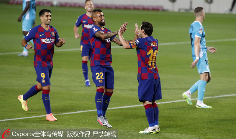 人民网北京6月17日电 北京时间6月17日凌晨4点,19/20赛季西甲联赛第29轮迎来一场焦点战役。在诺坎普球场,巴塞罗那主场2-0轻取莱加内斯,多赛一场领先皇马5分。法蒂用一记穿裆冷射打破僵局,梅西罚进自己奔袭制造的点球。