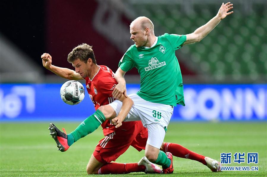 6月16日,拜仁慕尼黑队球员穆勒(左)在比赛中和不来梅队球员克拉森拼抢。当日,在2019-2020赛季德国足球甲级联赛第32轮比赛中,拜仁慕尼黑队客场以1比0战胜不来梅队,提前两轮夺得本赛季德甲联赛冠军,实现德甲联赛八连冠。 新华社/法新