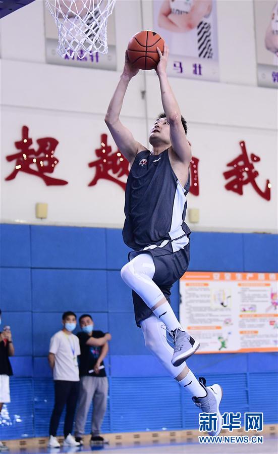 6月16日,辽宁本钢队球员丛明晨在训练中扣篮。当日,辽宁本钢队进行公开训练展示训练备战情况。6月20日辽宁本钢队将在青岛迎战北京首钢队。 新华社记者潘昱龙摄
