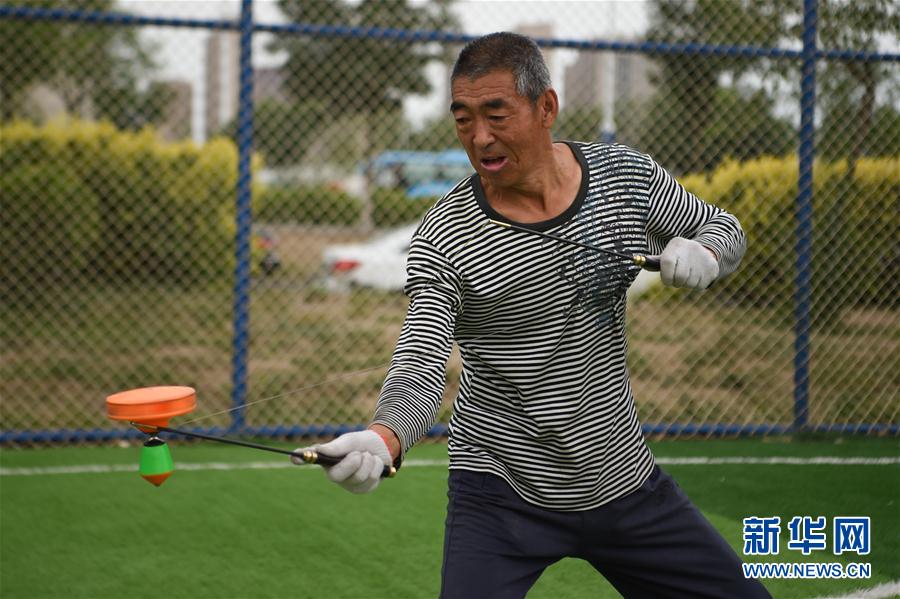 6月17日,一位老年空竹爱好者在抖空竹。 大鹏展翅、招财进宝、蜻蜓点水……在空竹高速旋转发出的嗡嗡声中,这些精彩的抖空竹动作引起了路人的关注。在内蒙古呼和浩特市,有一群老年空竹爱好者每天都会到锡林公园练习抖空竹;他们平均年龄超过了70岁,其中年龄最大的超过了80岁。老年空竹爱好者们通过抖空竹的方式锻炼身体,保持健康的身心状态。 新华社发(李志鹏摄)