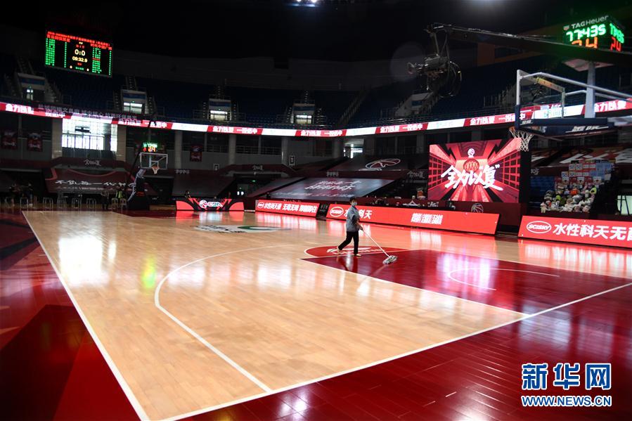 2019-2020赛季中国男子篮球职业联赛(CBA)将于6月20日复赛,将以赛会制空场比赛的方式在青岛与东莞两个赛区展开。青岛赛区作为承办复赛第一阶段的两大赛区之一,将有10支球队进行39场比赛。目前,承办青岛赛区的青岛国信体育馆已进行了场馆内部的升级改造。 图为6月18日,一名保洁人员在青岛国信体育馆内清洁地板。 新华社记者 李紫恒 摄