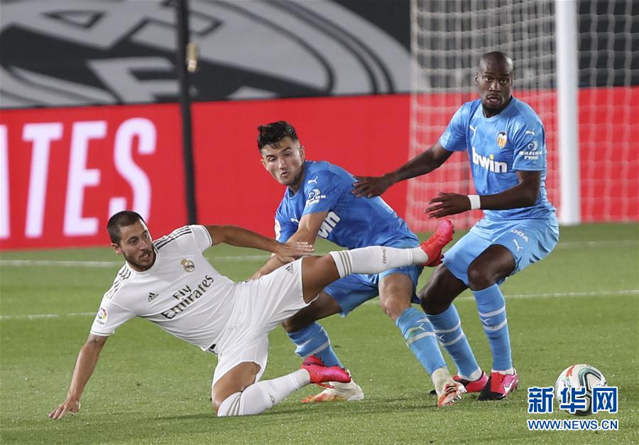 6月18日,皇家马德里队球员阿扎尔(左)与巴伦西亚队球员吉利亚蒙(中)在比赛中拼抢。 当日,在2019-2020赛季西班牙足球甲级联赛第29轮比赛中,皇家马德里队主场以3比0战胜巴伦西亚队。 新华社发(爱德华·皮特斯摄)