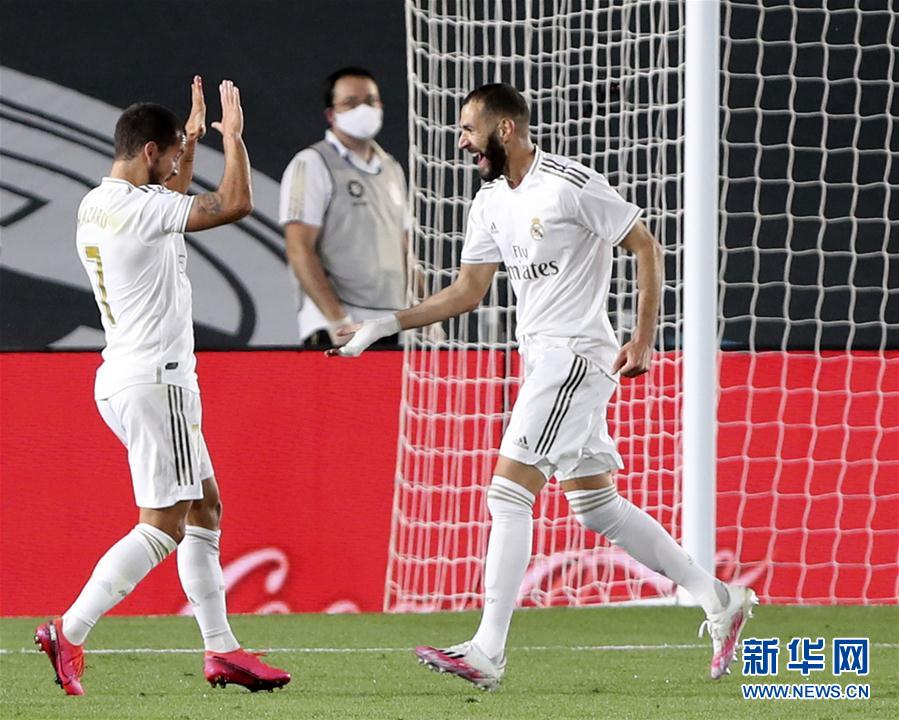 6月18日,皇家马德里队球员本泽马(右)在进球后同队友阿扎尔庆祝。 当日,在2019-2020赛季西班牙足球甲级联赛第29轮比赛中,皇家马德里队主场以3比0战胜巴伦西亚队。 新华社发(爱德华·皮特斯摄)