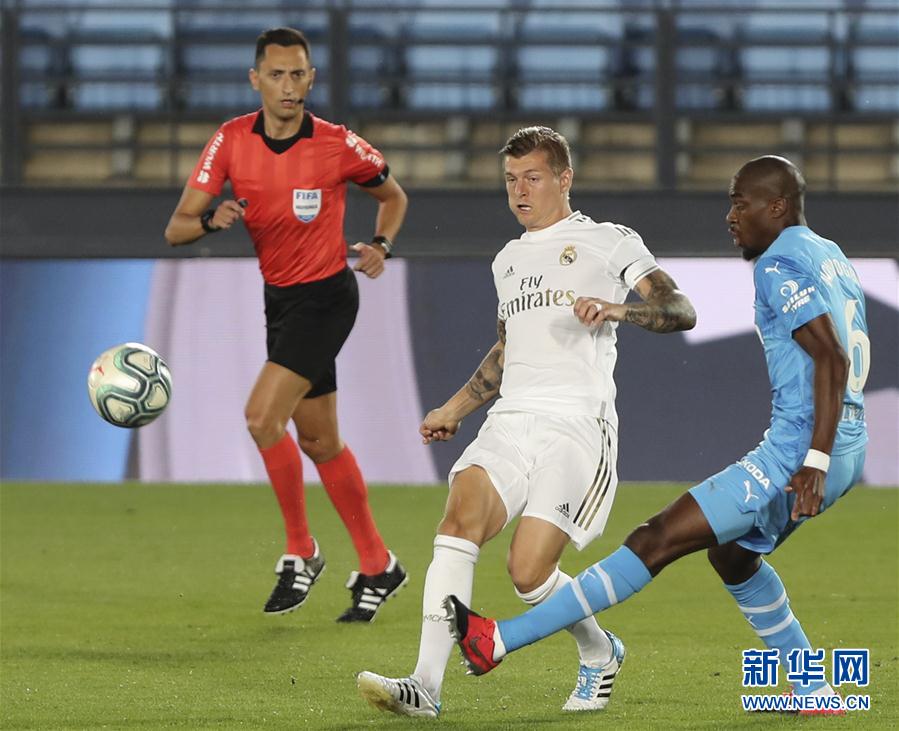 6月18日,皇家马德里队球员克罗斯(中)与巴伦西亚队球员孔多比亚在比赛中拼抢。 当日,在2019-2020赛季西班牙足球甲级联赛第29轮比赛中,皇家马德里队主场以3比0战胜巴伦西亚队。 新华社发(爱德华·皮特斯摄)