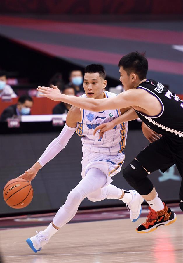 6月20日,北京首钢队球员林书豪(左)在比赛中带球突破。 当日,在山东青岛国信体育馆进行的2019-2020赛季中国男子篮球职业联赛(CBA)复赛第一阶段比赛中,北京首钢队对阵辽宁本钢队。 新华社记者 李紫恒 摄