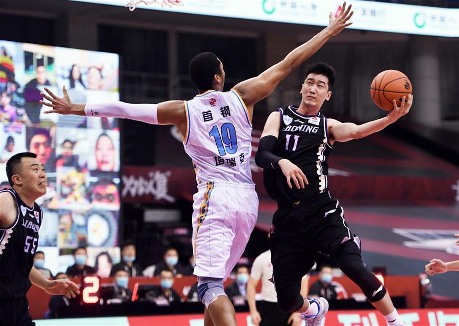 6月20日,北京首钢队球员加尼尤(右二)在比赛中防守辽宁本钢队球员刘志轩。 当日,在山东青岛国信体育馆进行的2019-2020赛季中国男子篮球职业联赛(CBA)复赛第一阶段比赛中,北京首钢队以91比82战胜辽宁本钢队。 新华社记者 李紫恒 摄