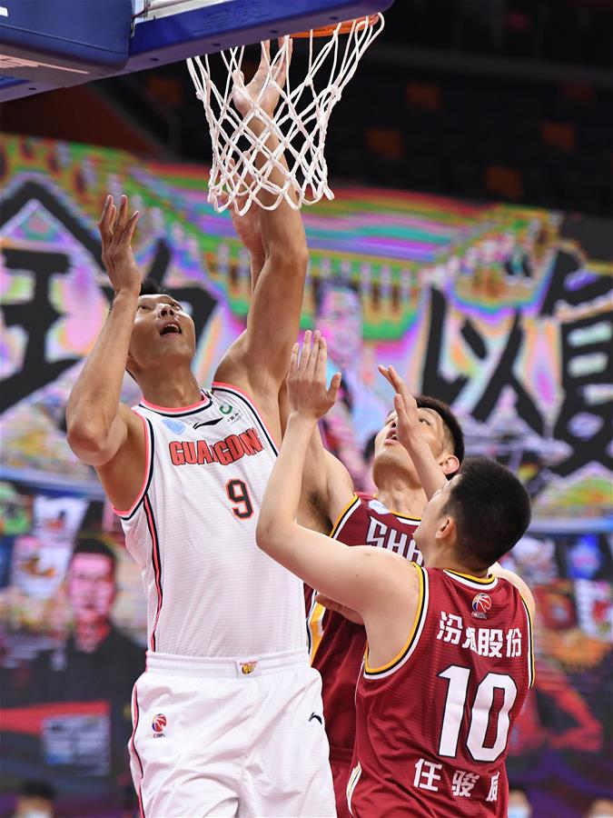6月20日,广东东莞银行队球员易建联(左一)在比赛中上篮。 当日,在广东东莞银行篮球中心举行的2019-2020赛季中国男子篮球职业联赛(CBA)复赛第一阶段比赛中,广东东莞银行队以105比82战胜山西汾酒股份队。 新华社记者 梁旭 摄