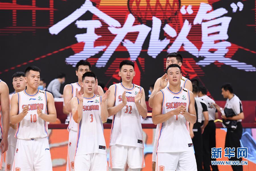 当日,在广东东莞进行的2019-2020赛季中国男子篮球职业联赛(CBA)复赛第一阶段比赛中,四川五粮金樽队以101比72战胜天津先行者队。 新华社记者 梁旭 摄