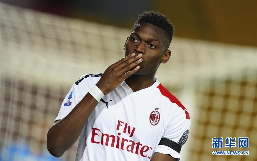 6月22日,AC米兰队球员莱奥进球后庆祝。 当日,在2019-2020赛季意大利足球甲级联赛第27轮比赛中,AC米兰队客场以4比1战胜莱切队。 新华社/美联
