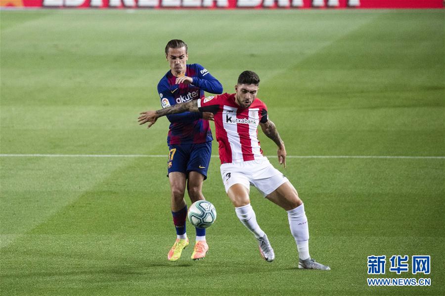 6月23日,巴塞罗那队球员格列兹曼(左)与毕尔巴鄂竞技队球员努涅兹拼抢。 当日,在2019-2020赛季西班牙足球甲级联赛第31轮比赛中,巴塞罗那队主场以1比0战胜毕尔巴鄂竞技队。 新华社发(胡安·戈萨摄)